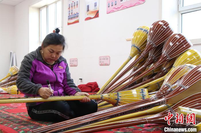 目前,新和縣依其艾日克鎮加依村樂器產業園內共有160余人穩定就業,圖為村里的婦女在樂器產業園工作。茍繼鵬 攝
