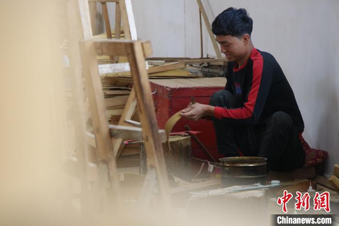 10月15日,新疆阿克蘇地區新和縣依其艾日克鎮加依村樂器制作匠人努爾冬·司馬義在檢查手工制作的樂器。茍繼鵬 攝