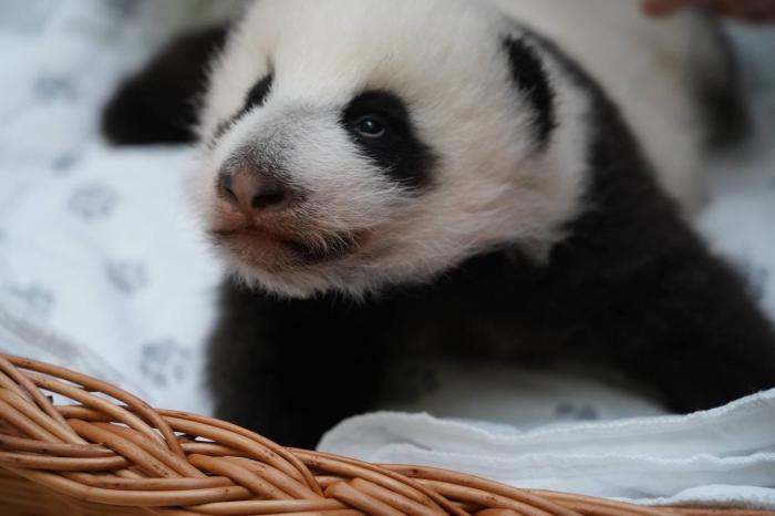 園方10月6日發文稱,熊貓幼崽在出生后第42天睜開了眼睛,開始對光線有所反應,但要到兩個月左右時才能開始看見東西。