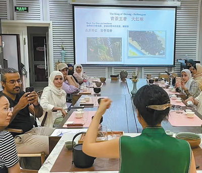 2023年7月,沙特中文學(xué)習(xí)者那丹(左三)在北京語言大學(xué)體驗(yàn)中國茶文化。
