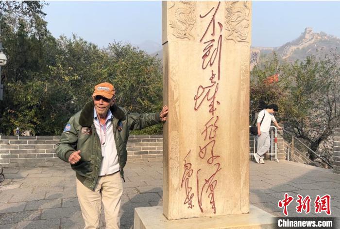 10月29日,102歲高齡的美國飛虎隊老兵哈里·莫耶登上北京八達嶺長城,并在“好漢碑”前豎起大拇指留影。中新社記者郭超凱 攝