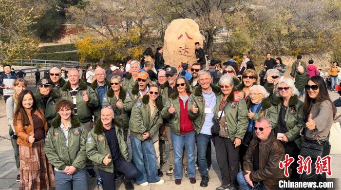 10月29日,美國飛虎隊老兵哈里·莫耶、飛虎隊指揮官陳納德將軍的外孫女尼爾·凱樂威以及一眾飛虎隊老兵家屬在北京八達嶺長城景區合影留念。中新社記者郭超凱 攝
