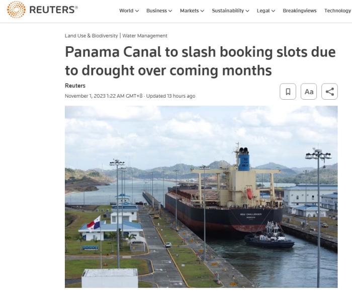 據報道,巴拿馬運河管理局(ACP)在10月30日晚間的公告中表示,從11月3日開始,巴拿馬運河的通行名額將從每天31個減少到每天25個,并將在未來三個月內逐步減少,計劃到2024年2月減少為每天18個名額。