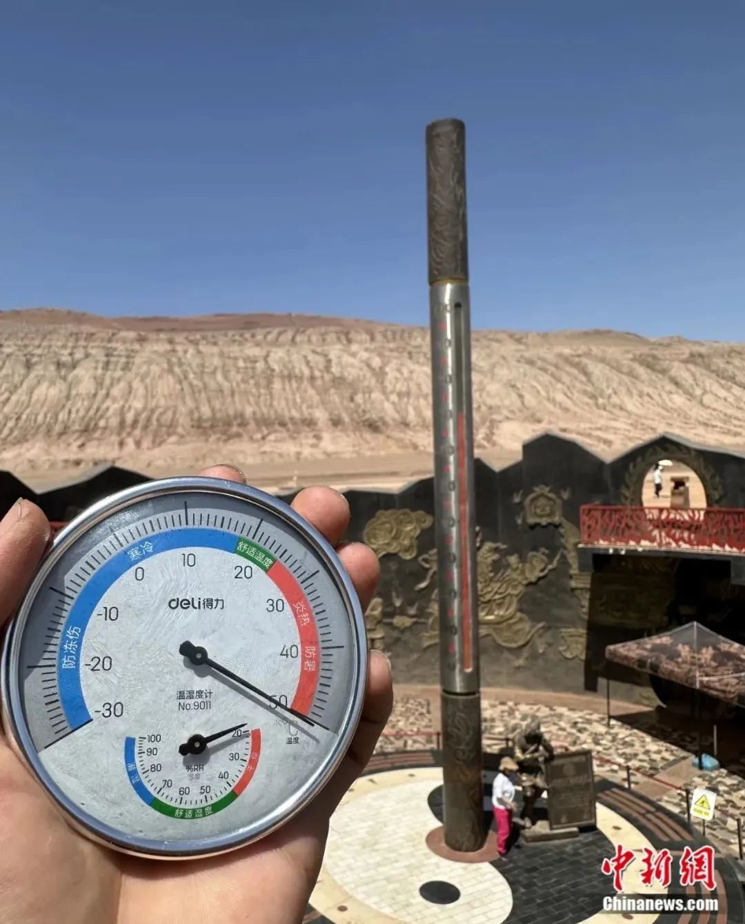 火焰山景區內金箍棒溫度計溫度超50度。木塔力甫 攝