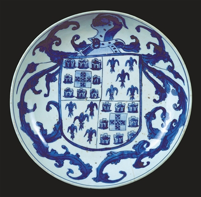 與此同時,葡萄牙貴族開始向中國專門定制紋章瓷器。據博物館陶瓷收藏館館長拉斐爾·阿爾費寧介紹,定制瓷器在葡萄牙的最早記載出現于1528年,即明代嘉靖年間。葡萄牙人非常珍視這些中國瓷器,甚至在返程途中給它們加飾銀制配件。由于當時歐洲人多使用質地粗糙的石制或陶制用具,設計獨特、淡雅脫俗且白皙光潔、能耐高溫的中國瓷器脫穎而出,備受珍視。當時,葡萄牙貴族多以中國瓷器為地位的象征,定制瓷器一時間蔚然成風。其中,由葡萄牙阿爾布克爾克家族定制的瓷盤尤具代表性:盤心繪有盾形紋章,配以十字形盾牌和百合花,藍白相間,光潔細膩。這件瓷器珍品既是歐洲藝術史上的美麗篇章,亦是中葡藝術交融出的靈感結晶。
