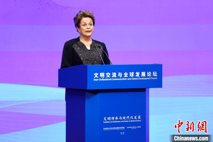 11月7日,由中共中央黨校(國家行政學院)主辦的文明交流與全球發展論壇在京開幕。圖為新開發銀行行長羅塞夫作主旨演講。中新社富田 攝
