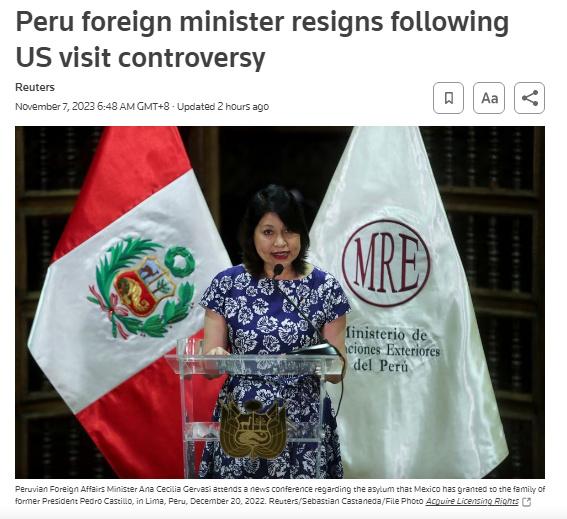 報道稱,外界質疑赫瓦西在處理秘魯總統博盧阿特上周訪美時的表現,這可能也是赫瓦西宣布辭職的原因。