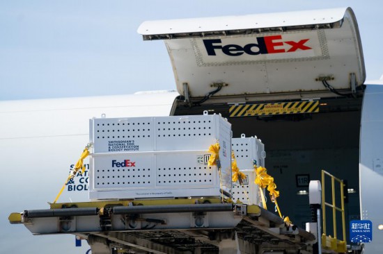 11月8日,在美國弗吉尼亞州的華盛頓杜勒斯國際機場,裝有大熊貓的特制“旅行包廂”運上專機。新華社記者劉杰攝