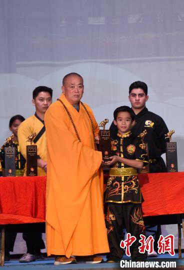 當地時間11月12日下午,由中國嵩山少林寺主辦的“不朽少林”少林功夫公演在已有逾百年歷史的美國洛杉磯Million Dollar劇院舉行。圖為嵩山少林寺方丈釋永信向“北美洲少林考功大賽”獲獎者頒獎。 中新社記者  張朔  攝