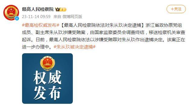 中新網11月14日電 據最高人民檢察院官方微博消息,浙江省政協原黨組成員、副主席朱從玖涉嫌受賄案,由國家監察委員會調查終結,移送檢察機關審查起訴。日前,最高人民檢察院依法以涉嫌受賄罪對朱從玖作出逮捕決定。該案正在進一步辦理中。
