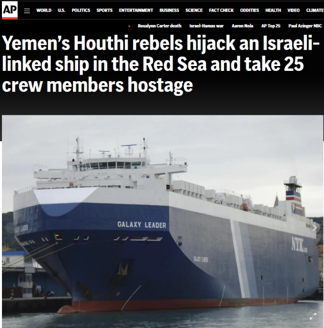 中新網11月20日電 綜合外媒消息,當地時間19日,也門胡塞武裝稱,他們在紅海海域扣押了一艘正在航行中的以色列貨船,并已將其帶到也門海岸。