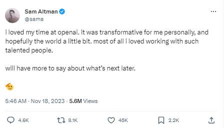 當(dāng)?shù)貢r(shí)間18日,奧特曼在社交平臺(tái)表示,“我很喜歡OpenAI的時(shí)光,這對(duì)我個(gè)人來(lái)說(shuō)是變革性的,也希望通過(guò)重塑世界帶來(lái)一些變革。最重要的是,我喜歡與這些才華橫溢的人一起工作。”