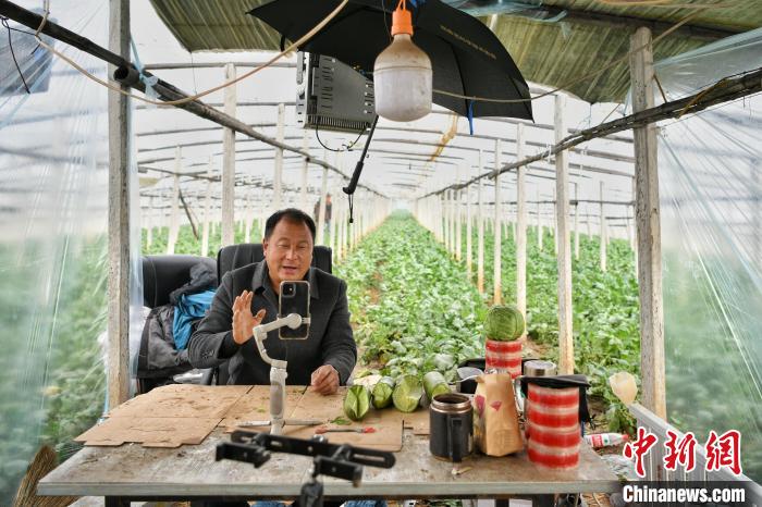 11月18日,在天津市西青區(qū)辛口鎮(zhèn)種植沙窩蘿卜的大棚內(nèi),農(nóng)民郭芝振通過手機直播推介沙窩蘿卜。 中新社記者 佟郁 攝