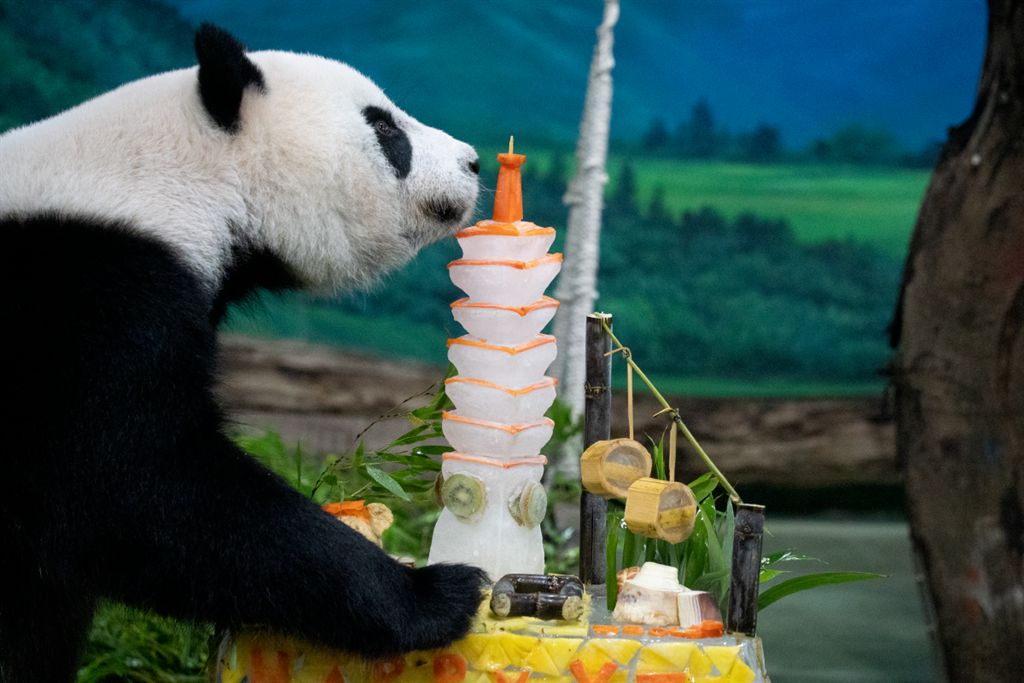 “圓仔”享用保育員準備的特制“蛋糕”,喜迎10歲生日。(臺北動物園提供/中時新聞網)