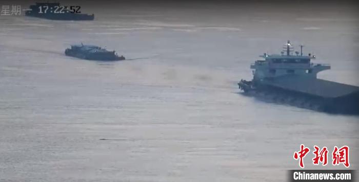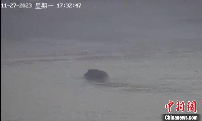 27日傍晚,南京海事局交管中心值班人員在通過長江三橋上的攝像頭例行巡查時,意外地發現江面上有一頭野豬在游泳。江蘇海事局 供圖