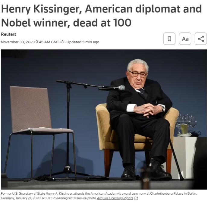 中新網11月30日電 據基辛格協會的消息,當地時間11月29日,美國前國務卿基辛格在其位于康涅狄格州的家中去世,享年100歲。
