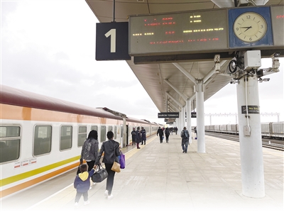 由中國路橋工程有限責任公司承建的蒙內鐵路是肯尼亞獨立以來建設的首條鐵路,也是一條采用中國標準、中國技術、中國裝備建造的現代化鐵路,被譽為中國和肯尼亞共建“一帶一路”標志性工程。圖為蒙內鐵路列車停靠在內羅畢站。