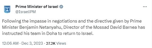 聲明稱,“談判陷入僵局后,經(jīng)(以色列)總理內(nèi)塔尼亞胡指示,(以色列情報機構)摩薩德負責人大衛(wèi)·巴尼亞命令其在多哈的團隊返回以色列。”