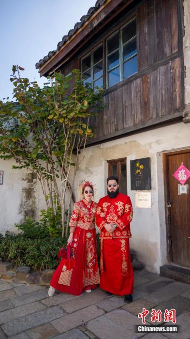 就在不久前,美莎和沙吶沙拍了中式婚紗照,身著紅色秀禾服的美莎選擇與先生在白墻灰瓦的中式園林建筑中留下二人愛情的見證。而兩人的婚禮也頗有戲劇性,雙方父母在土庫曼斯坦家鄉為兩人辦酒,沒能回國的他們則通過視頻遠程參加了自己的婚禮,接受家人們的祝福。美莎笑稱,她的微信婚禮很特別,很能代表中國速度。