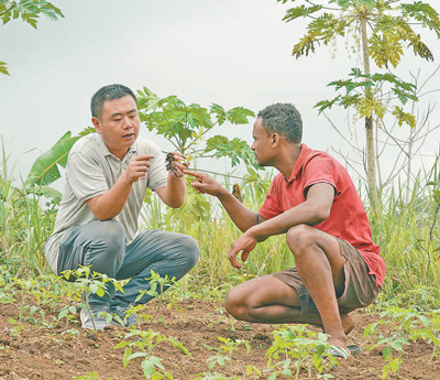 7月15日,在圣多美和普林西比洛巴塔縣卡德拉斯村,中國援圣普農牧業技術專家組專家許州達在田間指導農戶努內斯種植辣椒。