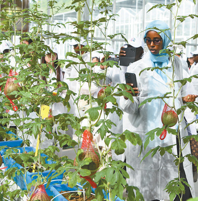 11月14日,參加中非農業合作論壇的嘉賓在海南三亞市吉陽區大茅村的農業科創中心參觀。