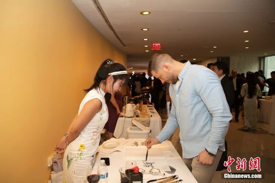 資料圖:當地時間6月29日晚,“何以文明”特展發布儀式在紐約聯合國總部舉行,與會嘉賓體驗中國書法。中新社記者 廖攀 攝