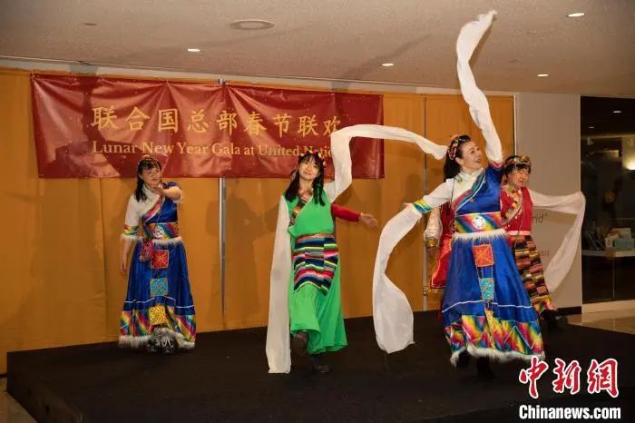 資料圖:當地時間1月20日,聯合國中國書會舞蹈團在紐約聯合國總部舉辦的春節聯歡晚會上表演《格桑拉》。中新社記者 廖攀 攝