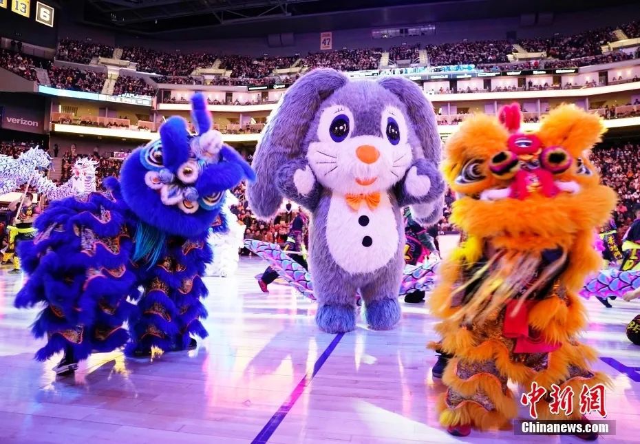 資料圖:當地時間1月22日,中國農歷新年正月初一晚,美職籃(NBA)金州勇士隊在主場迎戰布魯克林籃網隊的比賽中,按照多年的傳統慶祝中國農歷新年的到來。圖為兔子人偶出現在舞龍舞獅表演中。中新社記者 劉關關 攝