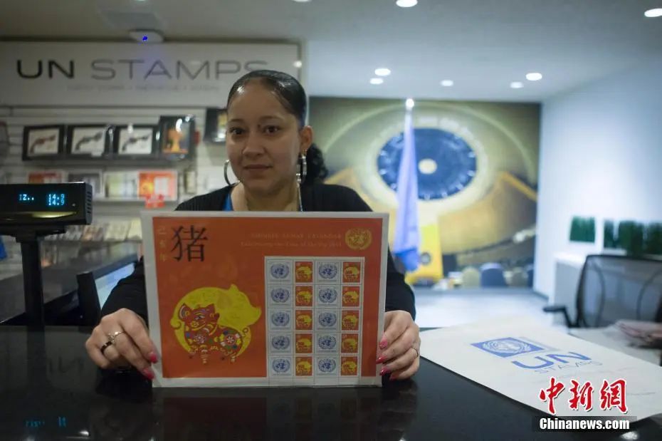 資料圖:2019年1月11日,為慶祝即將到來的中國農歷己亥豬年,聯合國郵政管理處正式發行“中國農歷生肖”系列己亥豬年特別版郵票。圖為紐約聯合國總部郵管處銷售點的工作人員展示己亥豬年特別版郵票。中新社記者 馬德林 攝