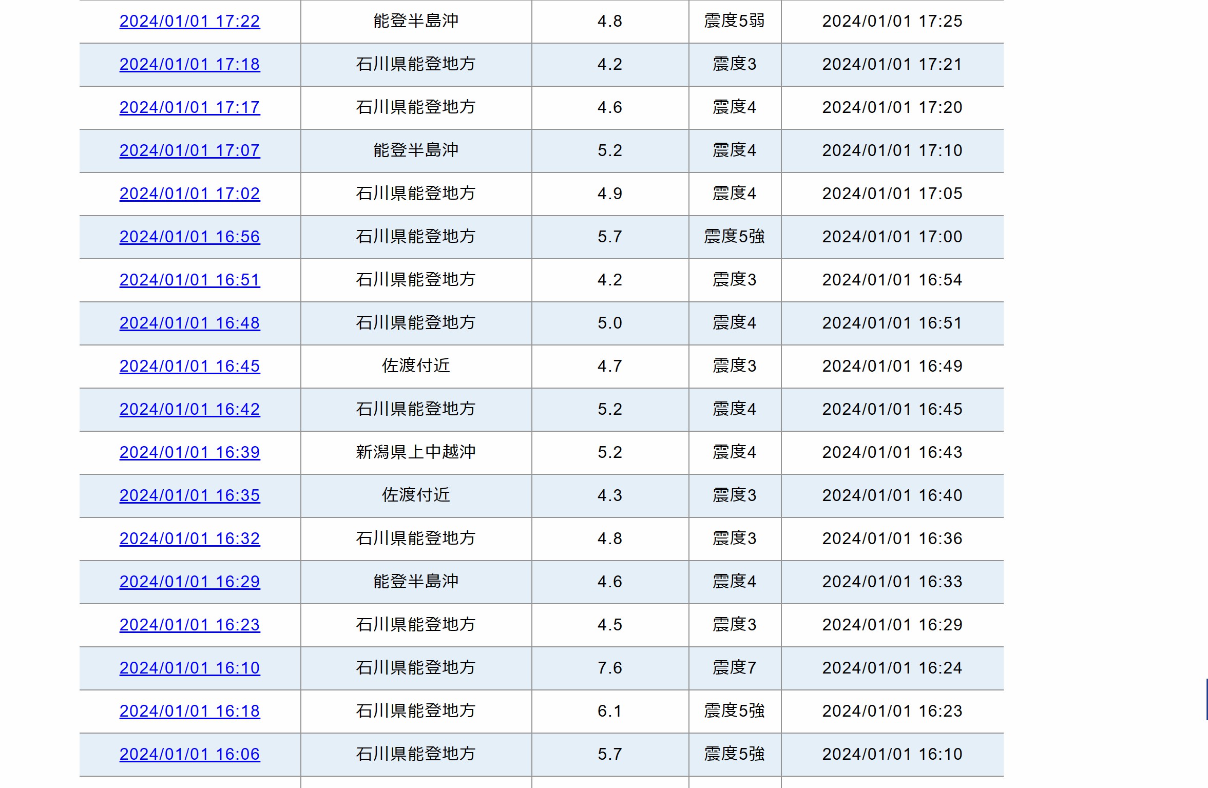 當地時間16時06分至17時22分期間,石川縣能登地區附近發生至少15次地震,地震震級均在4級以上,其中至少有7次在5級以上。