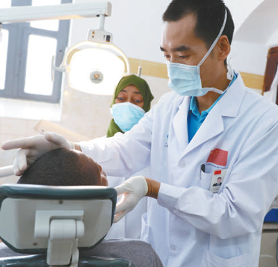 在納茲莫加醫院,口腔科醫生盛磊給患者看病。