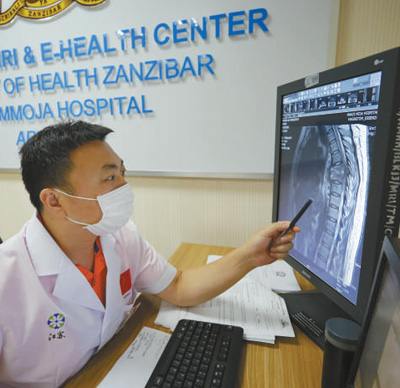 從第一臺X光機、CT設備,再到目前整個桑給巴爾地區唯一一臺核磁共振機,納茲莫加醫院影像科的設備物資都來自中國捐贈。不久前,影像科還增添了遠程視頻設備。通過遠程技術,中國醫療隊可以對接中國國內優質醫療資源,對當地復雜病例進行在線會診。桑給巴爾地區現有的5名影像科醫生,就是在一批批中國醫療隊隊員的帶教下成長起來的。
