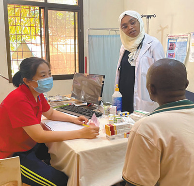 醫療隊在桑給巴爾島開展義診,圖為內科醫生劉翠霞(左一)接診患者。