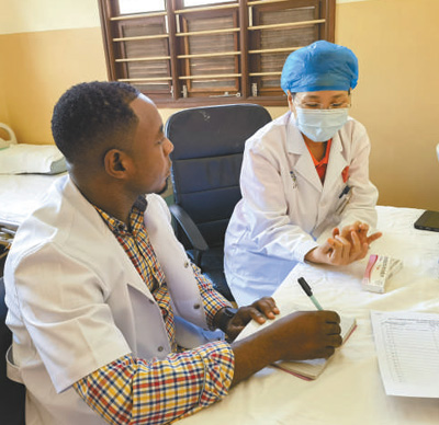 醫療隊在奔巴島開展義診,圖為婦產科醫生史曉瑩(右)同當地醫生交流患者情況。