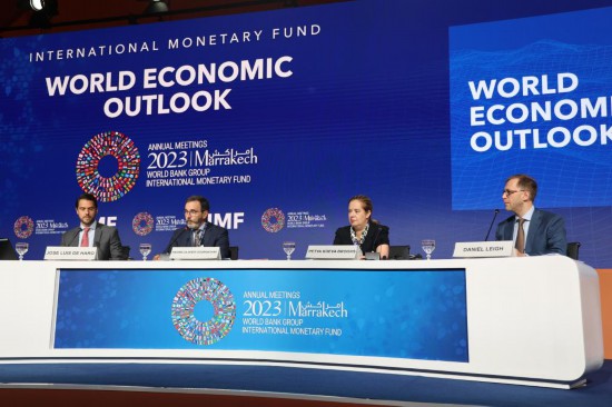 這是2023年10月10日在摩洛哥馬拉喀什拍攝的《世界經濟展望報告》發布會現場。新華社記者霍晶攝