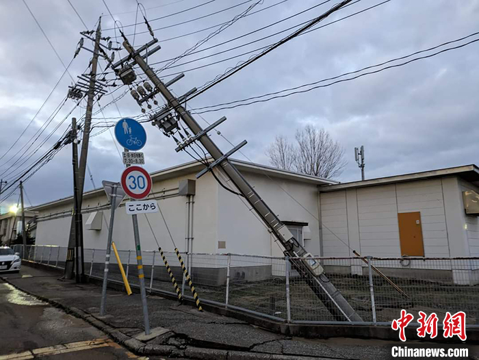 圖為1月1日,石川縣金澤市道路旁的電線桿因地震傾斜歪倒。 中新社發 鐘欣 攝