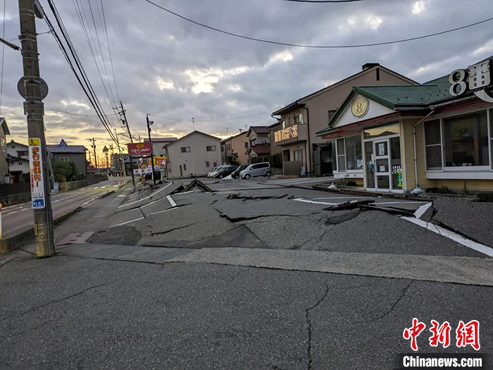 圖為1月1日,石川縣金澤市道路因地震導致龜裂受損。 中新社發 鐘欣 攝
