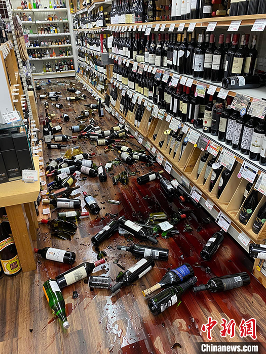 圖為1月1日,石川縣金澤市一家超市內酒類貨架上的商品因地震散落、破碎。 中新社發 鐘欣 攝