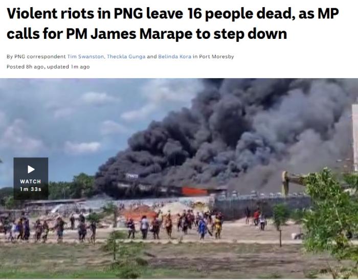 據澳大利亞廣播公司(ABC)報道,當天,巴新部分民眾利用警察罷工的機會縱火焚燒商店和企業設施,目前騷亂已造成16人遇難,其中首都莫爾斯比港有9人死亡,第二大城市萊城則有7人死亡。