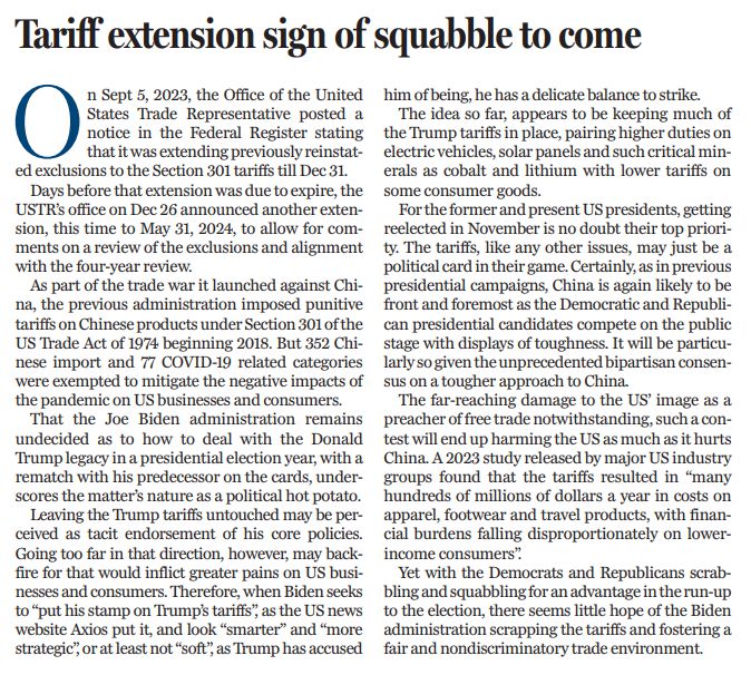 2018年,當時的特朗普政府以“國家安全”之名援引“301條款”(美國《1974年貿易法》第301條),對中國輸美商品加征懲罰性關稅。曾經嚴厲抨擊特朗普關稅政策的拜登上臺后,新瓶裝舊酒,換湯不換藥,大體保留了特朗普政府對中國商品加征的關稅。