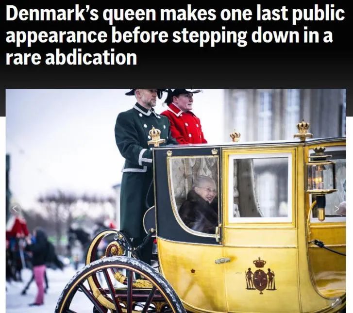 當(dāng)?shù)貢r(shí)間1月4日,是丹麥女王瑪格麗特二世最后一次以君主身份公開露面。現(xiàn)年83歲的女王乘坐“金馬車”穿過丹麥?zhǔn)锥迹簧倜癖娒爸鴩?yán)寒、強(qiáng)風(fēng)和雨雪,在沿途為她揮舞旗幟并歡呼。