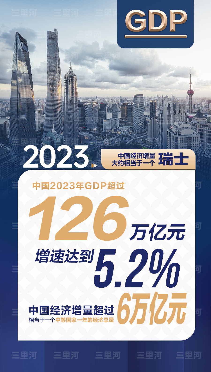 2023年中國經濟年報顯示,全年GDP超過126萬億元(人民幣,下同),增速達到5.2%。按照可比價計算,2023年中國經濟增量超過6萬億元,相當于一個中等國家一年的經濟總量。