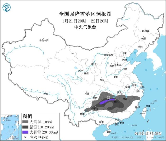 預計1月21日20時至1月22日20時,重慶東部、湖北西南部、貴州、湖南、江西、福建西部和北部、浙江南部、廣西北部、廣東北部等地的部分地區有大到暴雪,其中,貴州東部、湖南中西部等地局地有大暴雪(20~25毫米),上述部分地區新增積雪深度3~10厘米,局地可達15厘米以上。貴州東南部、湖南西南部、廣西北部、廣東北部等地局地有凍雨。