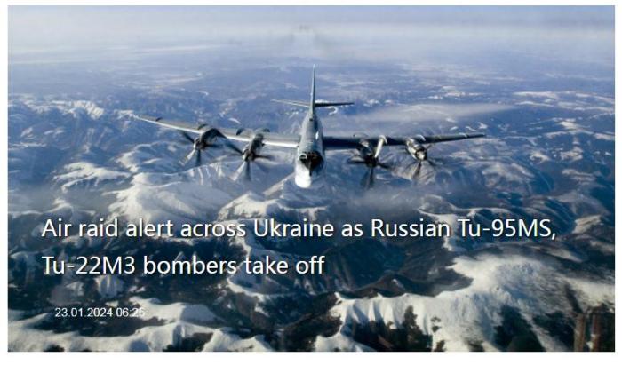 中新網(wǎng)1月23日電 據(jù)烏通社23日報道,烏克蘭全境拉響防空警報。報道稱,烏克蘭空軍記錄到當?shù)貢r間23日早些時候,多架圖-95轟炸機和圖-22轟炸機從俄羅斯起飛。