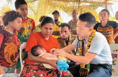 在巴布亞新幾內亞中央省村莊里,第十二批援巴新中國醫療隊副隊長、新生兒科副主任醫師劉振球為當地嬰兒聽診檢查。