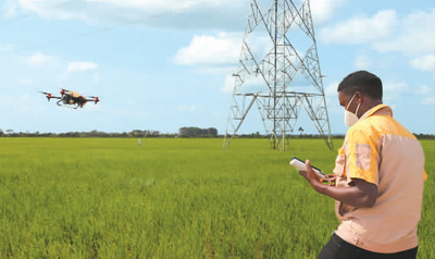 在烏干達卡隆古區盧卡亞鎮中億農業園,作業員赫伯特·阿加巴操控植保無人機噴灑農藥。