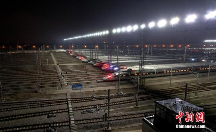 資料圖:航拍動車組停靠在武漢動車段的存車線上,蓄勢待發。 張暢 攝