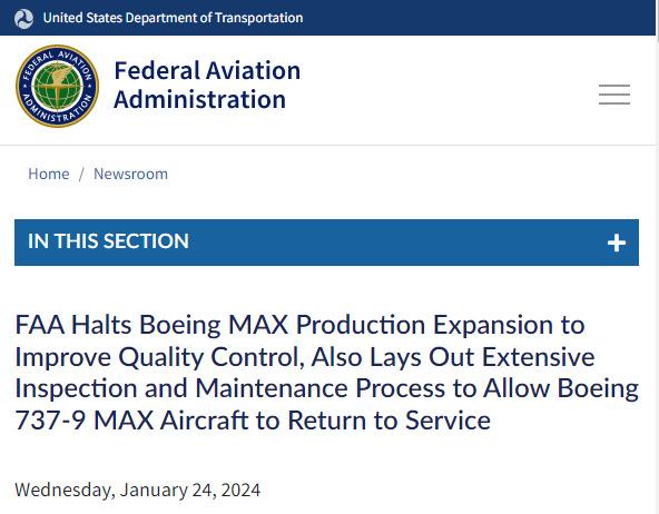 中新網1月25日電 當地時間1月24日,美國交通部發布公告稱,美國聯邦航空管理局(FAA)批準了必須對每架停飛的波音737 MAX9型飛機執行徹底的檢查和維護程序,檢查維護完成后這些飛機才有資格恢復運營。