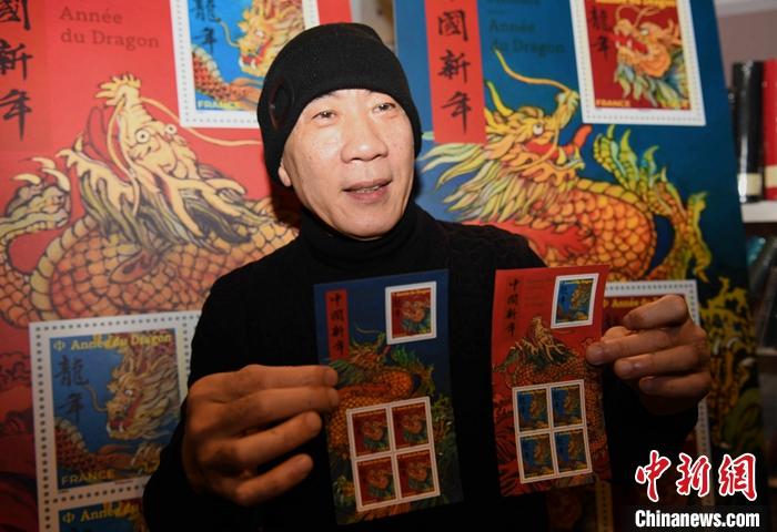 當地時間1月26日,法國發行龍年生肖郵票,為中法建交60周年增添濃郁的節慶氛圍。圖為法國郵政官員展示郵票。 中新社記者 李洋 攝