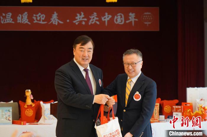 圖為中國駐韓國大使邢海明(左)向與會代表發放春節包。金琳 攝